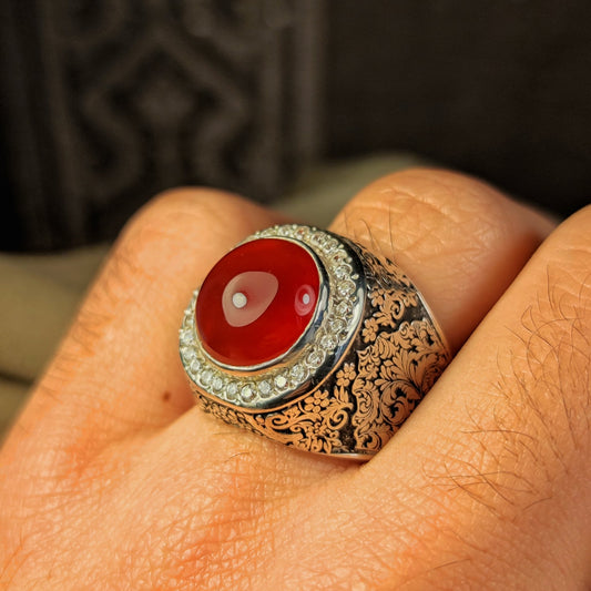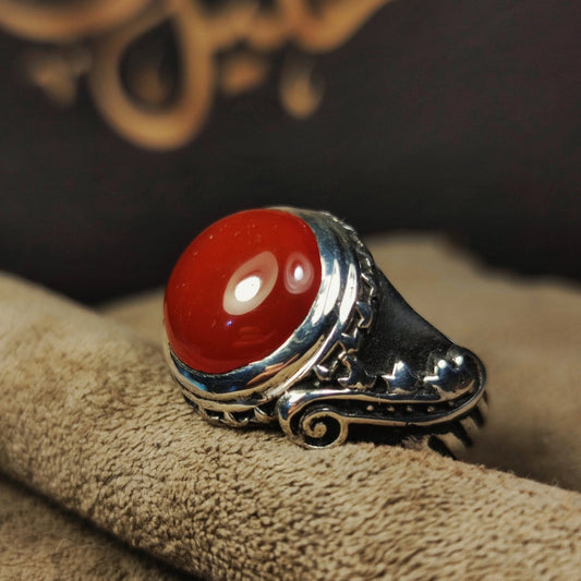 خاتم عقيق يمني كرزي طبيعي – صياغة يدوية فاخرة من الفضة عيار 950 بتصميم مخصص